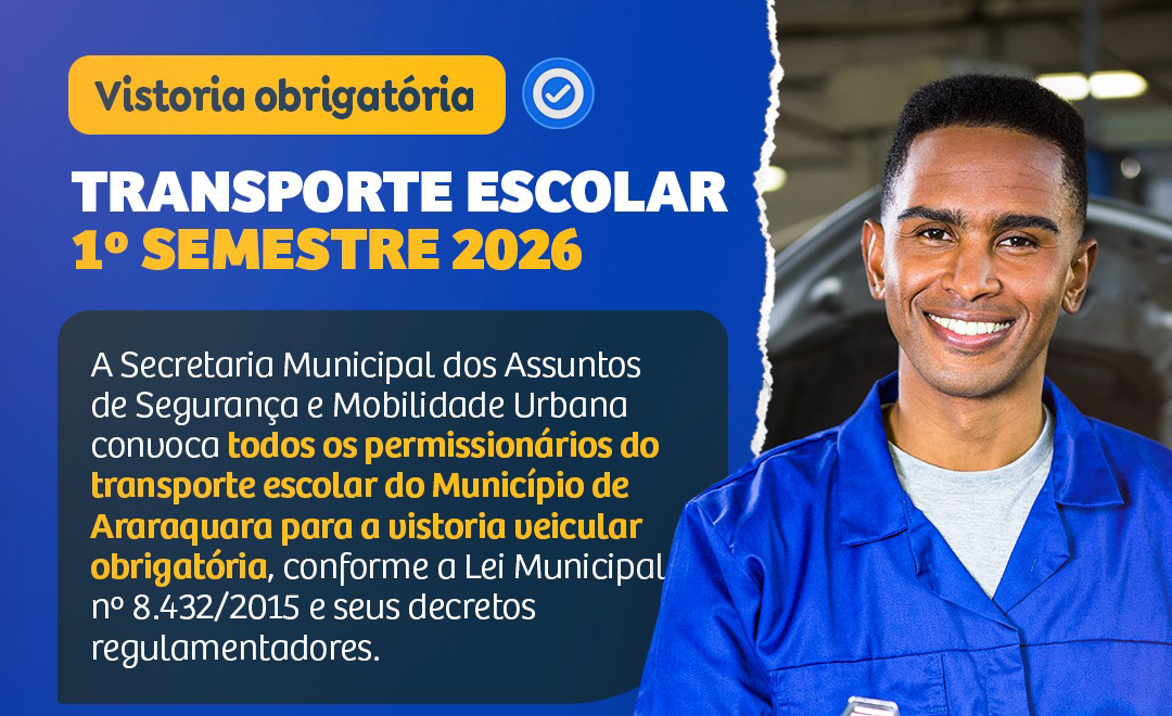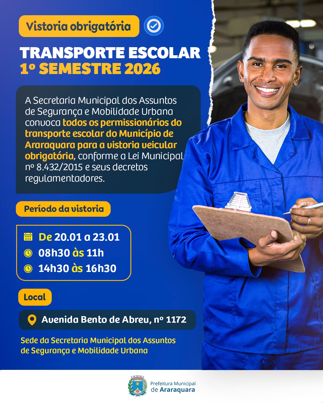 A Prefeitura de Araraquara, por meio da Secretaria Municipal dos Assuntos de Segurança e Mobilidade Urbana, informa que a vistoria veicular obrigatória para os permissionários do transporte escolar será feita na próxima semana. Os atendimentos acontecerão no período de 20 a 23 de janeiro de 2026, das 8h30 às 11h e das 14h30 às 16h30, na sede da Secretaria Municipal dos Assuntos de Segurança e Mobilidade Urbana, localizada na Av. Bento de Abreu, 1172.
